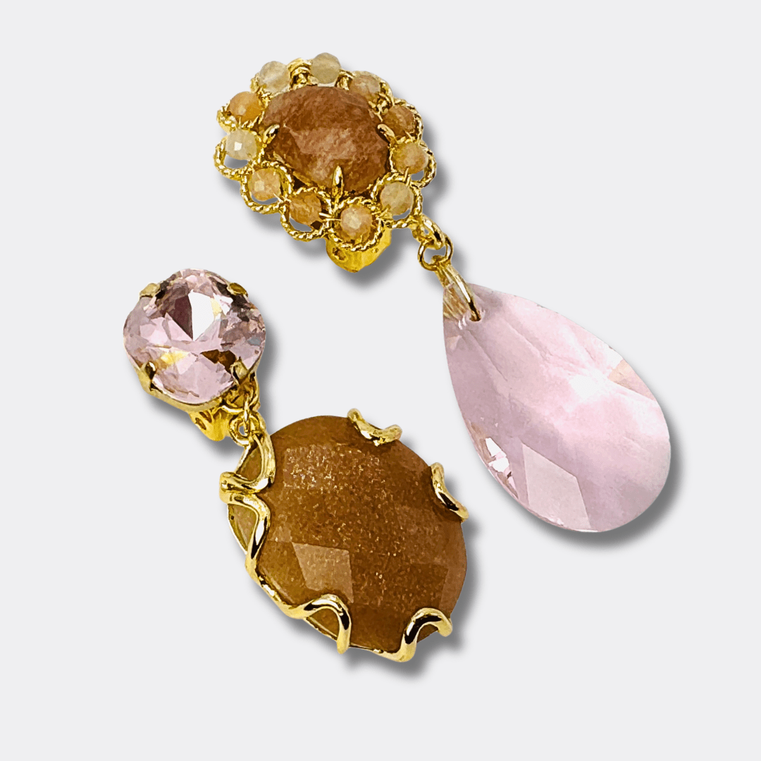 Deze asymmetrische statement clip oorbellen zijn een verfijnde combinatie van licht roze Swarovski® kristal en Agaat, uitgevoerd in warme abrikoos-, perziktinten die direct zachtheid én luxe uitstralen. Het fonkelende kristal vangt het licht met een subtiele champagneglans, terwijl de natuurlijke tekening van de Agaat zorgt voor diepte en karakter.