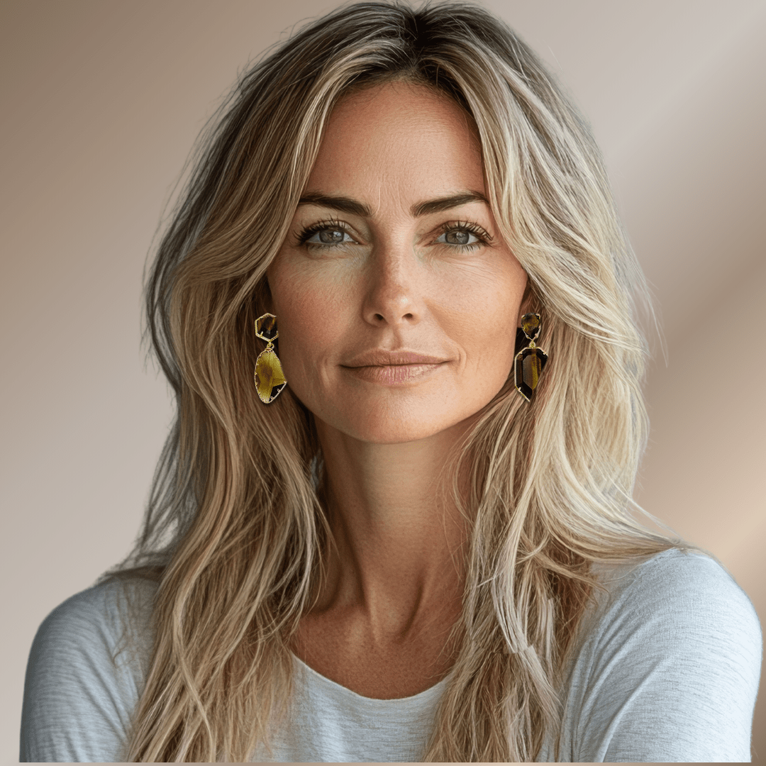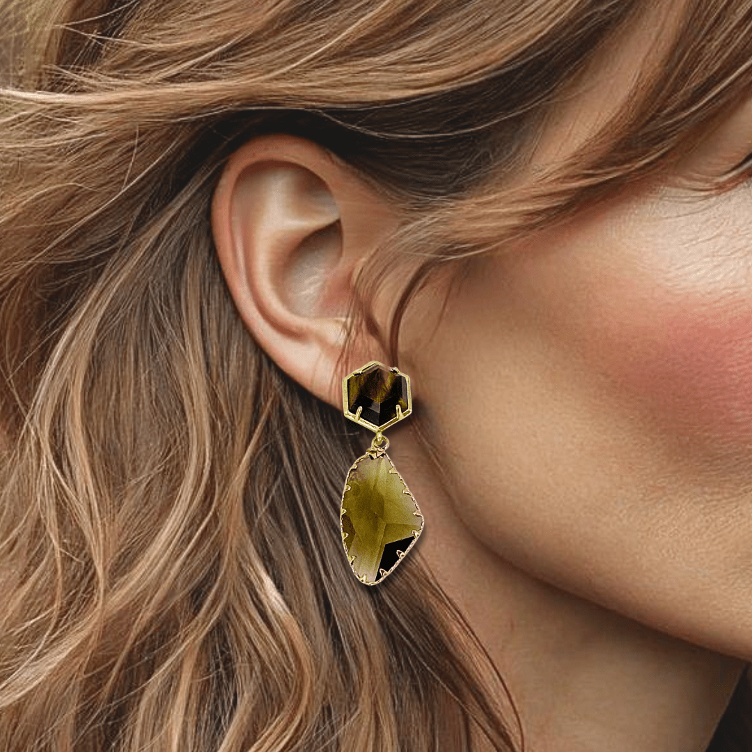 Deze asymmetrische statement oorbellen zijn een verfijnde combinatie van Swarovski® kristal en Tijgeroog, uitgevoerd in diepe bruin- en goudtinten. De compacte vorm maakt dit paar perfect voor dagelijkse glam, met net dat beetje extra karakter.