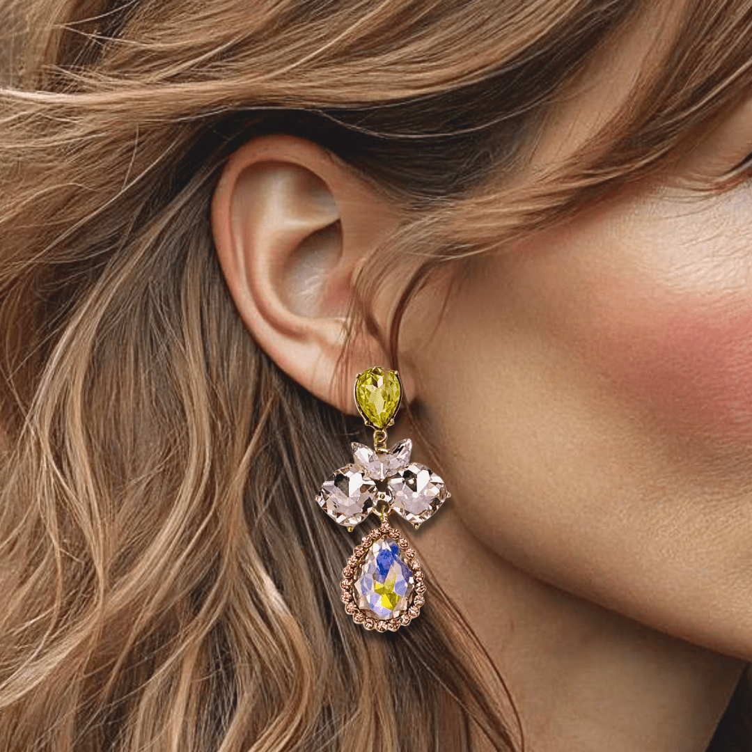 Asymmetrische statement oorbellen met Swarovski® kristal in stralende gele tinten. De bloemachtige vormen en royale druppel zorgen voor een speels, energiek ontwerp met een duidelijke presence. Zonnig, krachtig en allesbehalve bescheiden.