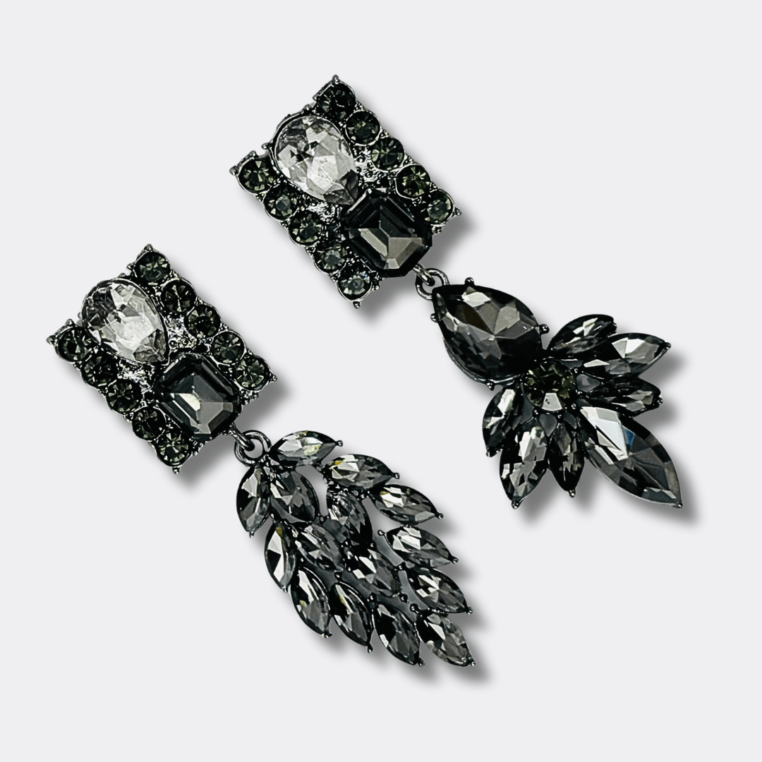 Deze feestelijke asymmetrische clip statement oorbellen is een combinatie van rookgrijs kristal, donkergrijze strass en zilvergrijs RVS. De combinatie van glanzende rechthoekige stenen en elegante bladvormen geeft deze set een krachtige, mysterieuze uitstraling met een vleugje edgy glamour.