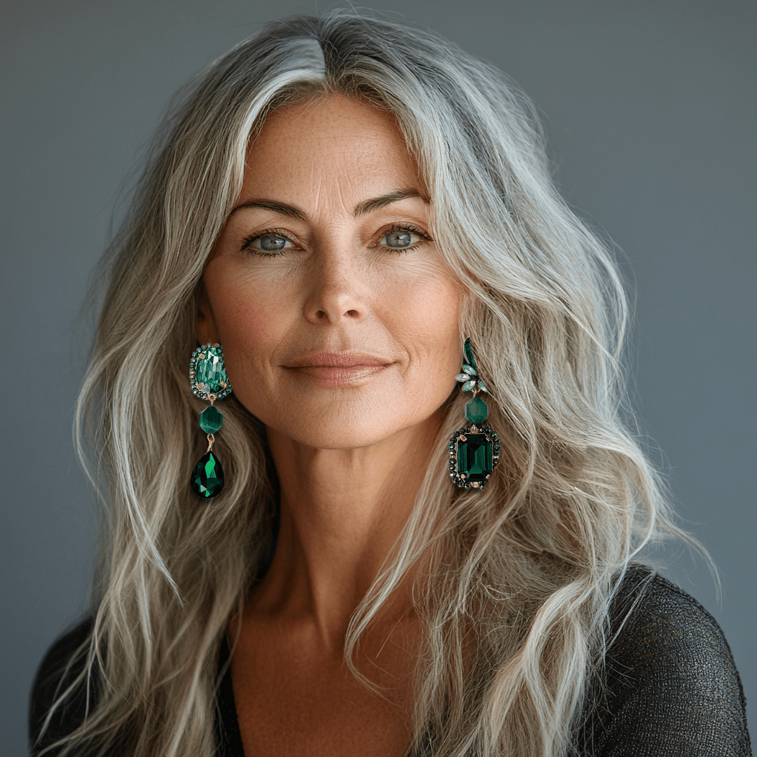 This asymmetrical set of statement earrings combines deep green, shimmering crystal and agate, a powerful blend that brings together luxury and natural energy. The sparkling emerald hues symbolize balance, growth, and inner strength, while the subtle sparkle of the crystal elegantly illuminates every movement.