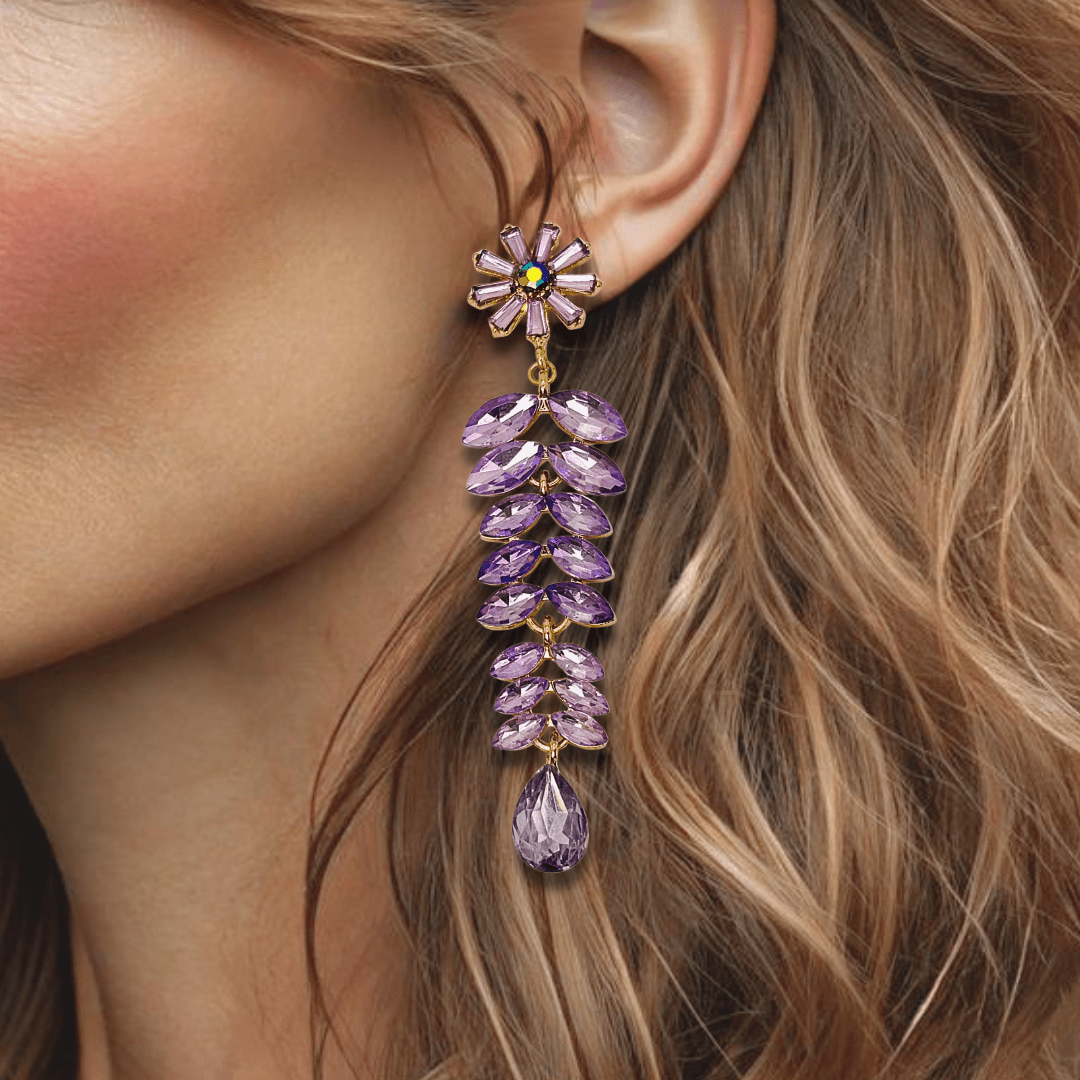 Asymmetric statement earrings with Swarovski® crystals in lilac and purple shades, enhanced with iridescent accents and playful lines. The combination of color, movement, and contrast makes this set both expressive and elegant.