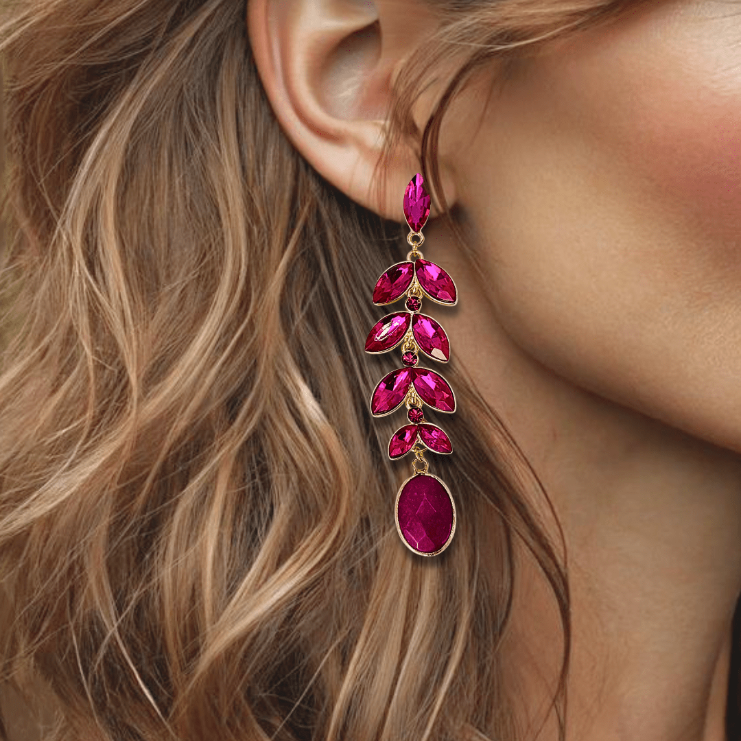 This asymmetrical set combines vibrant dark pink agate with sparkling fuchsia crystal. Agate is known for its protective and strengthening energy, while crystal emphasizes passion and vitality.