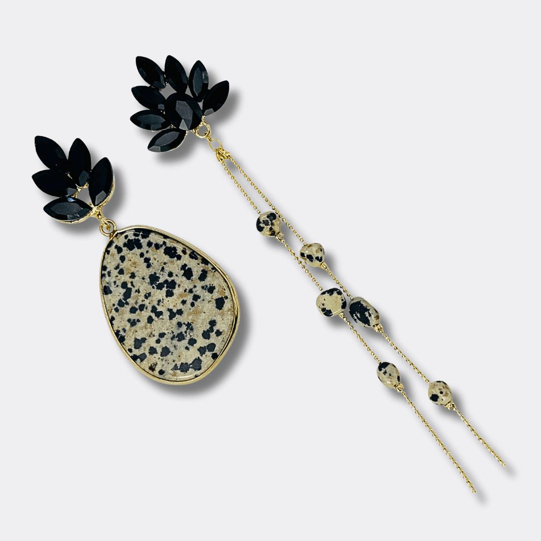 This symmetrical set combines the deep luster of black crystal with the playful, mottled patterns of Dalmatian Jasper. Black crystal symbolizes strength and protection, while Dalmatian Jasper brings balance and positive energy. Together, they create an elegant set that effortlessly blends boldness, playfulness, and luxurious refinement.