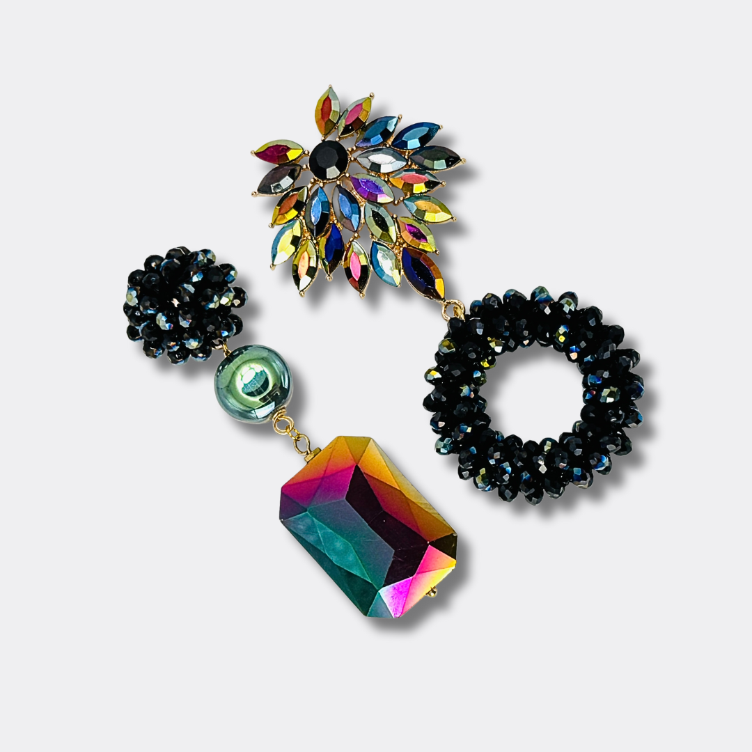 These asymmetrical statement earrings are a play of contrast and character. Sparkling Swarovski® crystals in multicolor AB shades catch the light with every movement, combined with deep dark beads and a bold geometric pendant. Bold, feminine, and surprisingly balanced.