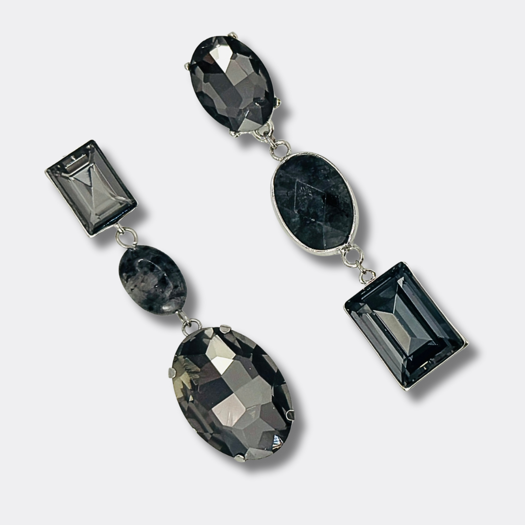 This asymmetrical set combines Larvikite with the elegant sheen of gray crystal, subtly finished in silver. Larvikite is known for its protective and grounding properties, while also stimulating inner strength and focus. Combined with crystal, this stylish set exudes tranquility, depth, and luxurious elegance.
