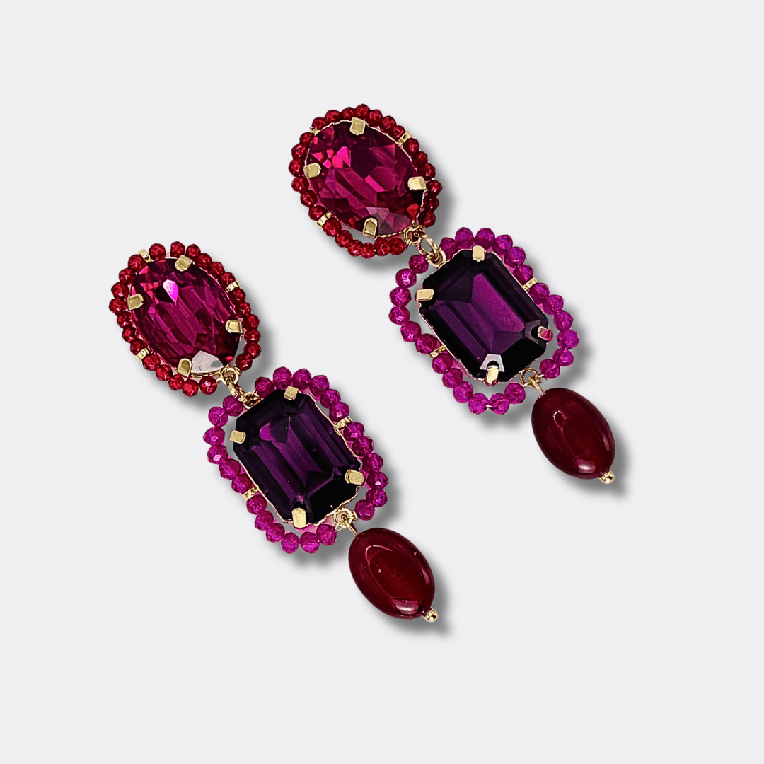 Un bijou raffiné et symétrique aux teintes intenses de violet, de fuchsia et de bordeaux chaleureux. Fabriqué artisanalement avec des pierres de verre aux riches nuances de violet et de fuchsia , serties de cristaux de verre étincelants. Une élégante agate bordeaux orne le bas du bijou, lui conférant une finition profonde et luxueuse. Sa structure en acier inoxydable plaqué or lui assure une allure à la fois durable et glamour.